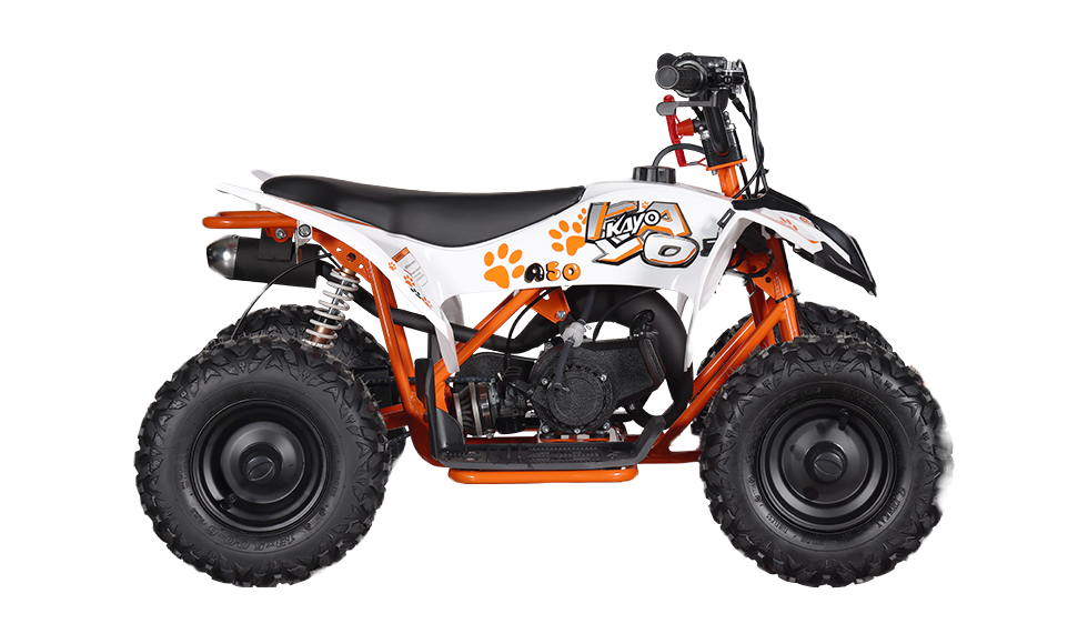 Young riders can safely explore off-road riding with the Kayo A50. It features a fully automatic transmission paired with a 2-stroke pull-start engine developed by Kayo, ensuring controlled and manageable power delivery. Key components such as the throttle speed limiter, rugged traction tires, and effective disc brakes provide excellent control for mastering balance, turning, and stopping. The frame is constructed from high-grade steel, engineered in-house by Kayo for durability and reliability.